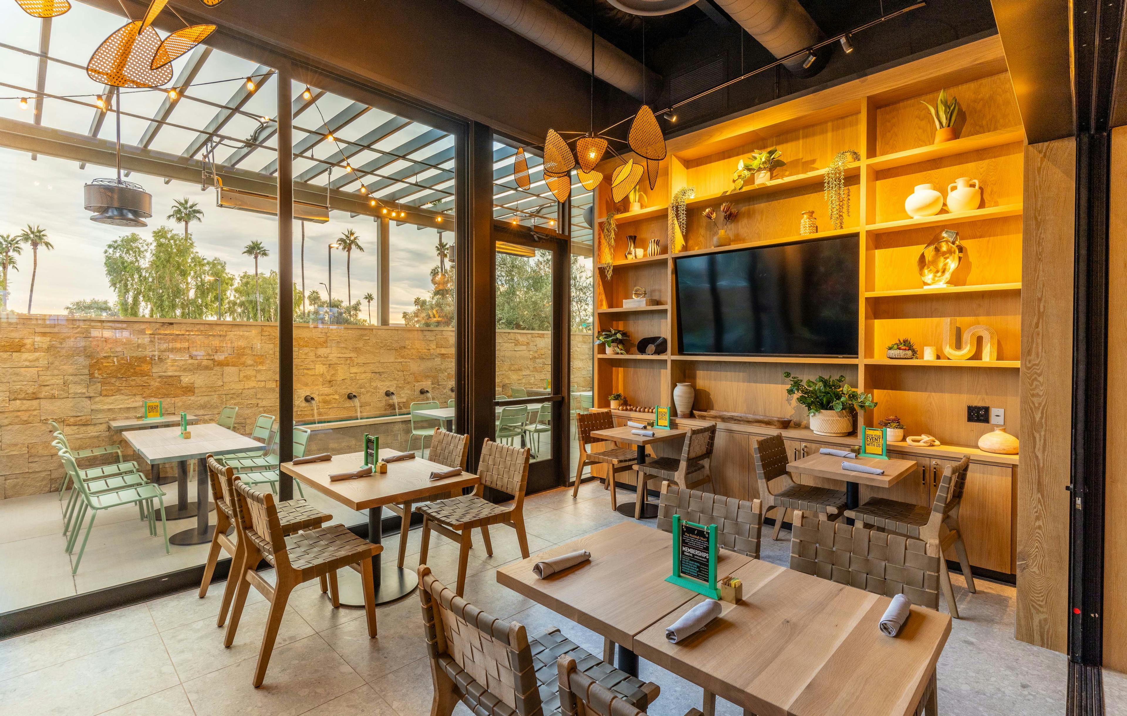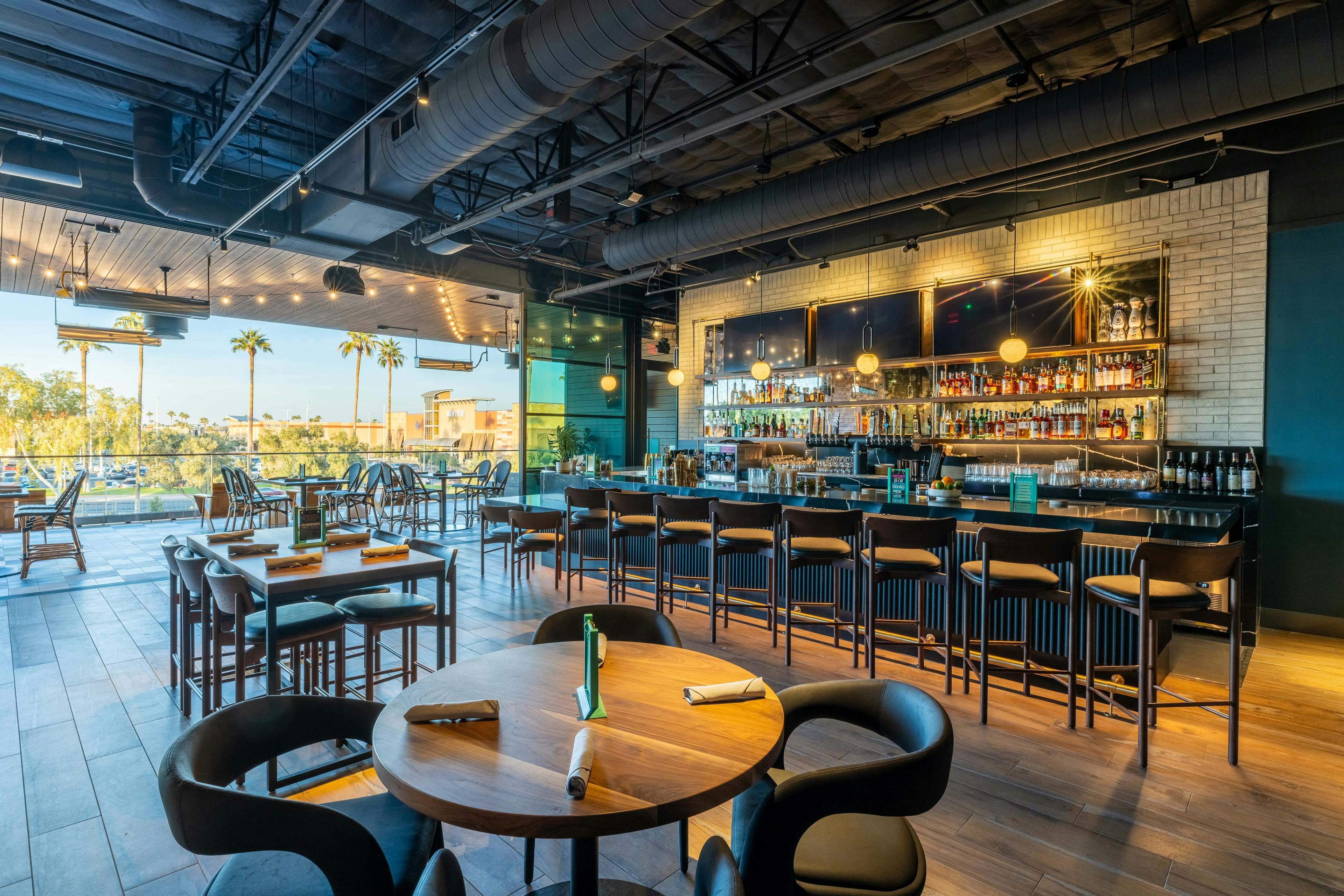 To book the top deck is to lay claim to the entire second floor and the win. This beautiful dining room has seating for up to 68 guests, a full private bar, and two golf simulator bays. The crown jewel is the patio balcony Sporting views over every court, the lawn and the stage, equipped with two outdoor TVs and fireplaces as well as overhead heaters and misters. This is where the eagles pirch.
